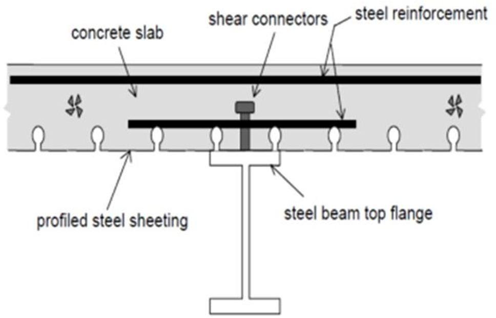 Shear connectors connected on the top flange of the steel girders provide the composite action between the steel girders and slab, increasingboth stiffness and strength. This kind of arrangement plays an importantrolein theseismicresponse of a structure.A major element of composite structure: 1. Composite column 2. Composite Beam 3. Deck slab 4. Shear Connectors Major elements of Shear Connector: 1. Perfobond ribs 2. Oscillating Perfobond strips 3. Waveform Strips 4. Channel connector 5. Pyramidal Shear Connectors 6. Rectangular Shaped Collar Connectors.