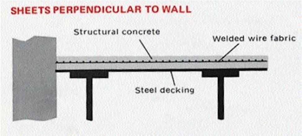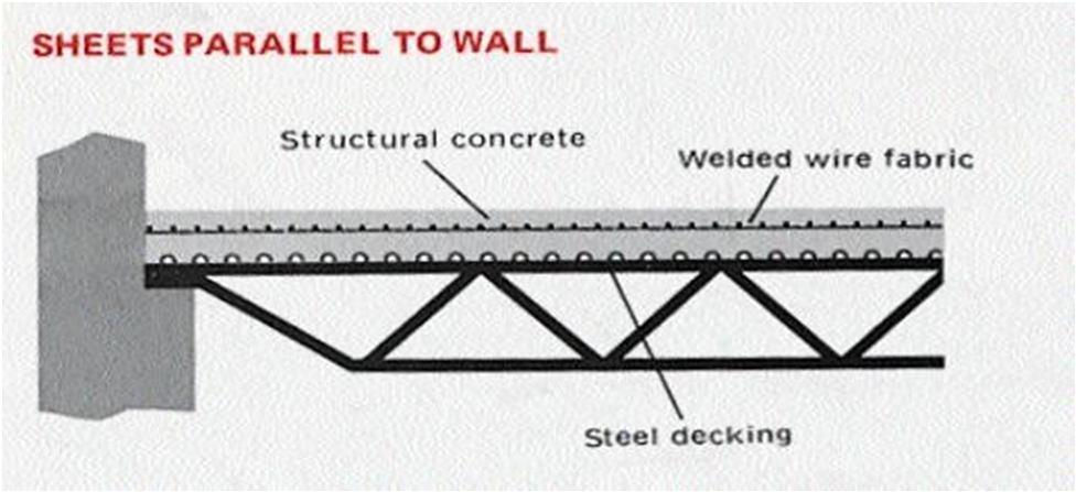 Decking with embossed ribs to develop a mechanical shear bond with concrete. Ends are die set for a neat fit and side laps are interlocking.