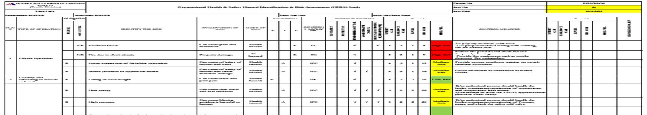 The proposed action for the hazard in boiler and thermo back machine is to hot surface area, wood and coal handling, hot oil chamber, steam line ,electrical hazard and trolley movement ,cleaning process in this operation maybe related to boiler and thermo back machine. This machine due to create health .Its rotating parts maybe Entanglement of workers clothes and hairs due to rotating part, Finger or hand struck by in rotating parts .The wood due to shifting in fabric storage area by the help of trolley, Injury from the steam line and oil pipe line, maybe due to handling activity .to avoid those insulate and cover the steam and oil pipe line handling procedure given to the employees some materials handling only authorized person only should remain within restricted zone under supervision, with particular attention paid to proximity electrical cables and equipment’s. Locate machine tools at a safe distance from other work areas and from walkways. Conduct regular inspection and repair of machine tools in properly in particular protective shield and safety devices/ equipment’s. Use appropriate PPE (Personal Protective Equipment’s) such as PPE (The heat resistive glove and leather apron, goggle and safety shoe ,safety helmet, dust mask) .Respiratory Hazards: Dust generated in boiler machines includes dusts, which are present boiler and thermo back machine area.