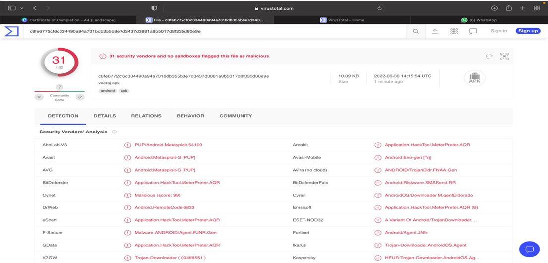 Index Terms: Malware, VirusTotal, Cuckoo sandbox, Android Apk, Software security, Kali linux, Metasploit.
