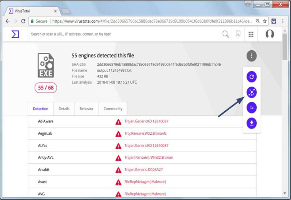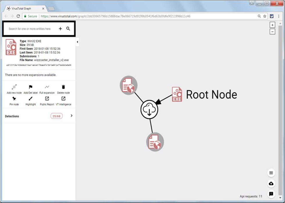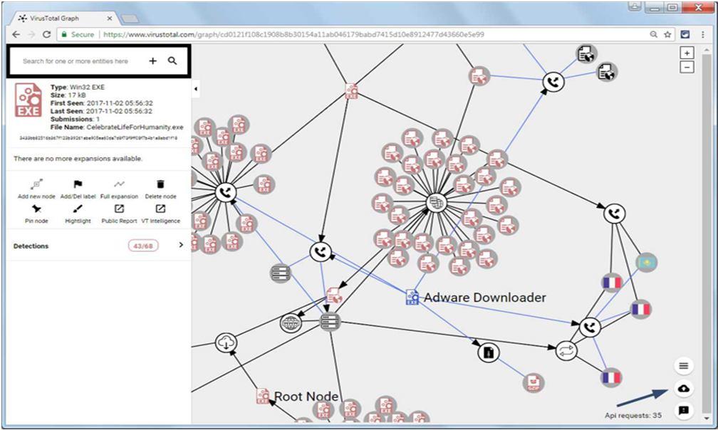 A user may notice information on an uploaded file graphically with the help of the VirusTotal Graph generated. This utility makes it simple to see data like hosts connected to, files created, and more. This is a data visualization tool that was constructed on top of the VirusTotal database. It offers a simple interface for pivoting and navigating between files, URLs, domains, and IP addresses, and it knows how they are related. We created the network and observed the relationships among the samples by selecting each node in the graph. Selecting the nodes, we can show the important details of each object instantly. We can add labels and get a detailed report by analyzing the VirusTotal public and VirusTotal Intelligence report. In the Graph page, there is an item called the Root Node. This is the object associated with the file that was submitted to VirusTotal. From this node, arises various arrows showing the information related to the sample.