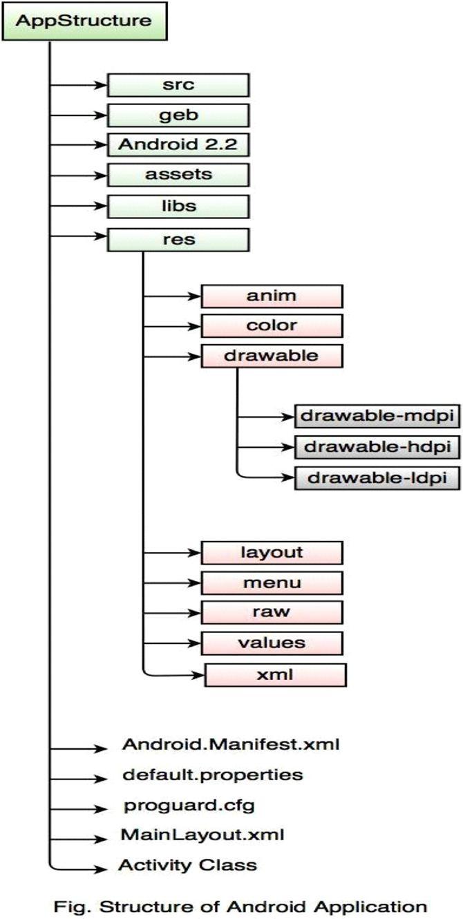 f) Structure of Android Application: The figure above shows the basic components of an Android application. An Android application in Eclipse or any developmenttool has a predefined structure with code and resources organized in a set of folders.