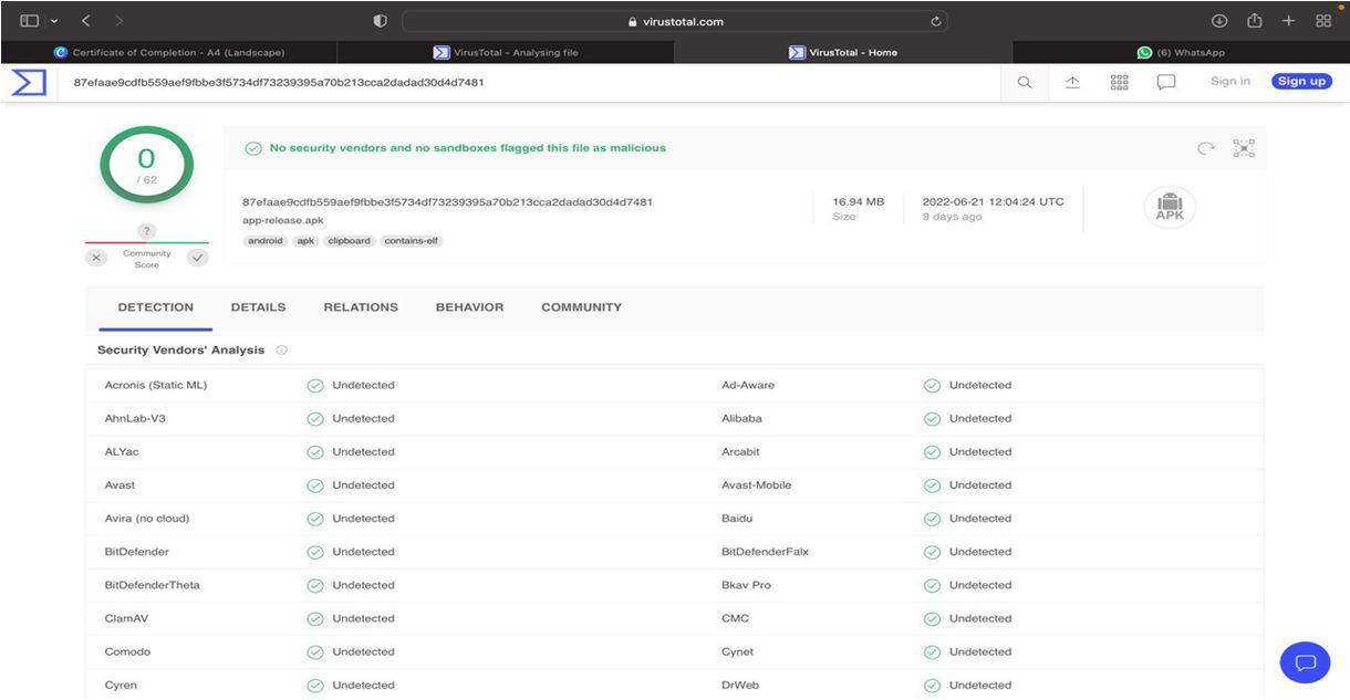 The score is Zero which indicates that the android application and the device in which it is installed both are free from the Malware.