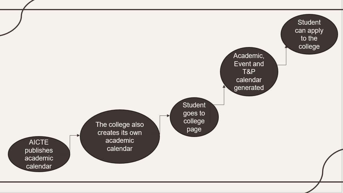 6) One Stop platform for the entire university event planning-The highlighting and the main feature of our project is the calendar which will be a centralized and once AICTE mentions the event deadlines the events will be organized into 3 groups-Academic, Events and T&P automatically and thus would help to create a one stop platform for uniforming the university event management.