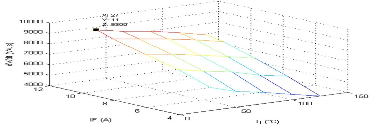 V.2.3. Voltage Rise Time (trv) :In this section, we try to improve the influence of temperature and forward current IF on the the(dV/dt)off capability at the turn off behavior of IGBT. Figure 15illustrates the evolution of the collector emitter voltage VCE(dV/dt) during the turn off transition of the IGBT (IRGBC20U) versus the junction temperature Tj. When increasing temperature, the P base resistance will also increase, because of a reduction in carrier mobility. This, cause a reduction in (dV/dt)off capability [17]. -5,00E-008 0,00E+000 5,00E-008 1,00E-007 1,50E-007 2,00E-007 2,50E-007 0