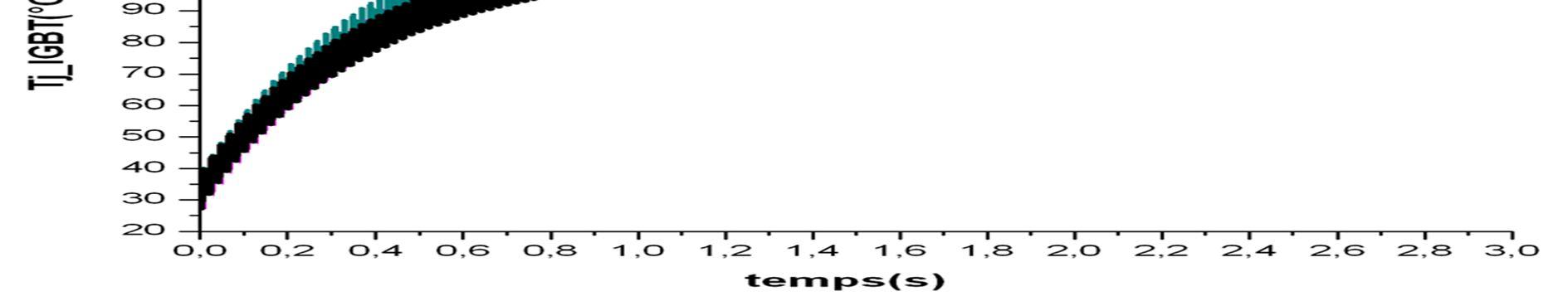 Figure 29 and 30 shows the evolution of the dissipated power and the estimated junction temperature in the IGBT respectively These results are obtained with the refined model(SABER), the classical electrical averaged model, and the developed electrothermal model. The obtained waveforms show a good agreement between the proposed electrothermal averaged model and the refined model. An important error is registered when a classical electrical averaged (model 2) model is used.