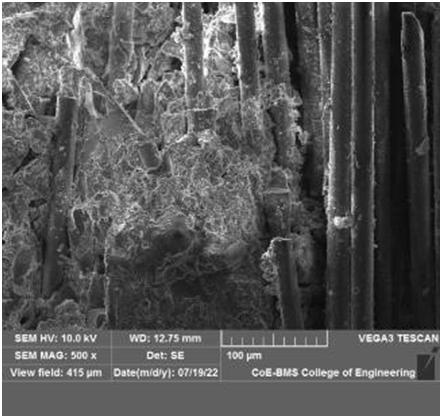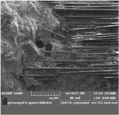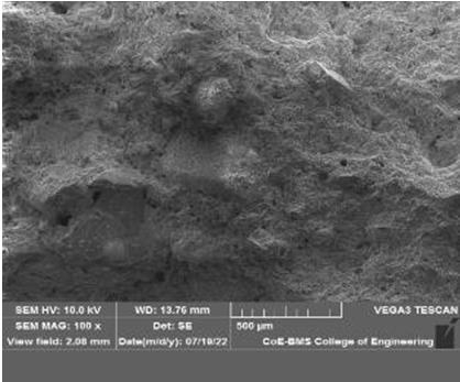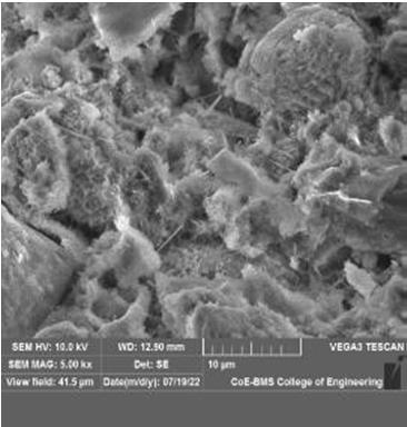 A scanning electron microscope is a type of microscope which provides magnified detail image of an object by scanning with the help of focused beam of electrons. The produced image can show information on sample topography and surface composition. The microstructure and topography of the HPC are as described in the following Figures for different percentage of basalt fibers.