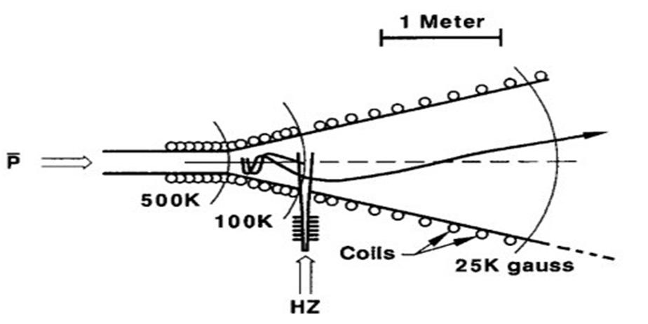Gerald P. Jackson (2009) puts forth an argument in favor of harvesting antimatter in space [10]. He proposes the idea of giant embedded spherical nets on which electric charges are imposed. He argues that a filter that only allows antiprotons to enter the center of the harvester can be formed by adjusting the charge levels. 6 x 108 antiprotons were being produced per hour in the Accumulator in Fermilab [11]. This would amount to 0.85ng of antiprotons per year A facility named New Injector which was supposed to turn on in 1998 would be capable of producing a total of 14ng per year. A conceptual Recycler Ring which would be placed inside the Main Injector Ring would increase the production rate by 10, which would result in maximum production of 140ng per year. Fig. 2 shows the schematic of the Antiproton Catcher Trap at CERN.