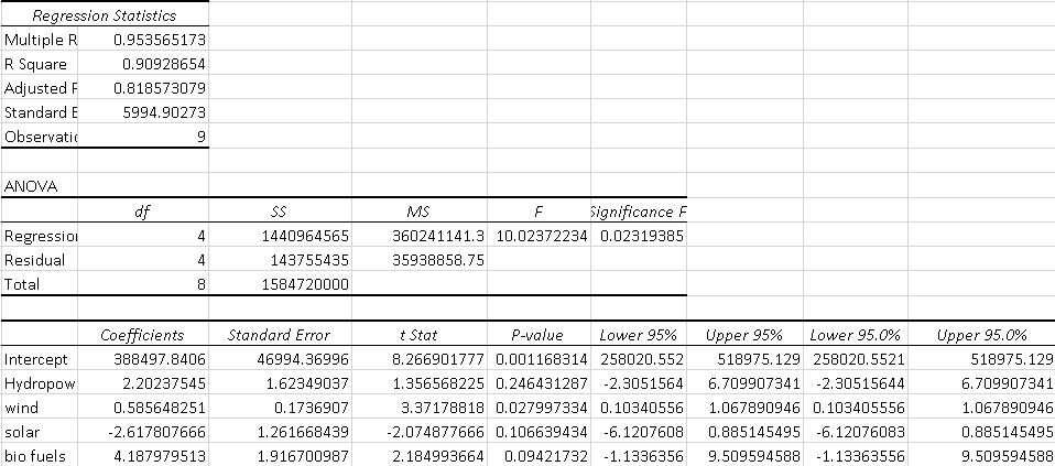 The data from table 7 is used to perform regression. The regression shows that solar energy production negatively impacts total energy production whereas hydro power energy has the greatest positive impact on total energy production. Using equation (10), regression is done to forecast the total energy production, as shown below.