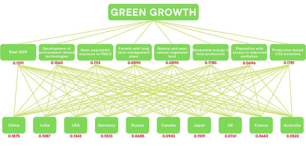 Green growth means fostering economic growth and development while ensuring that natural assets continue to provide the resources and environmental services on which our well being relies. (OECD 2017) The focus of green growth strategies is ensuring that natural assets can deliver their full economic potential on a sustainable basis. That potential includes providing critical life support services clean air and water, and the resilient biodiversity needed to support food production and human health. Natural assets are not infinitely substitutable, and green growth policies consider that. Researchers like Meng Li have researched inclusive green growth in Asia Pacific [3]. Saira Naseer has assessed green economic efficiency in china using AHP, and the research indicates that the AHP model reduces uncertainty and shortcoming in the evaluation process [4] Research comparing the green economy in Iran with OECD countries strongly suggests using some other MCDM techniques such as AHP, ELECTRE, and Fuzzy MCDM [5]. Piwowarski Mateusz used TOPSIS and VIKOR methods to study sustainable development in EU countries [6] To avoid developing unfavorably, “green growth” suggests pursuing such an economic development through which we can avoid degradation of the environment, loss of biodiversity, and unmanageable usage of natural resources (OECD, 2017). Green growth strongly emphasizes the fostering conditions needed to innovate, invest, and compete to stimulate economic growth without derailing resilient ecosystems [9]
