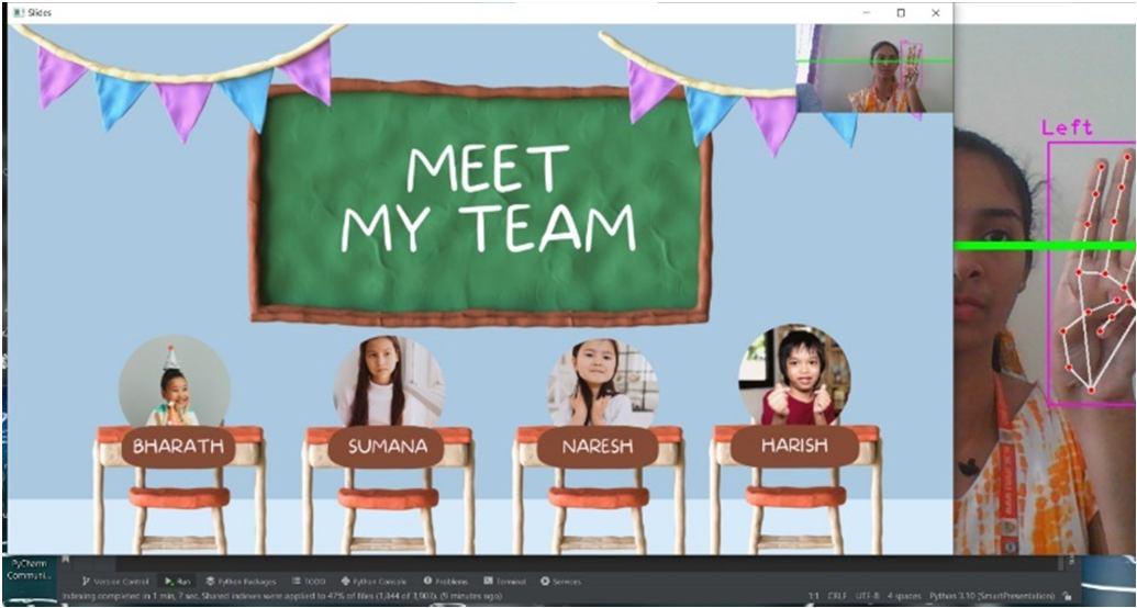 [2] Muhammad Idrees, ashfag Ahmad, Mahammad Arif Butt, Hafiz Mahammad Danish. As Controlling PowerPoint Using Hand Gestures in Python by Journal by international Recent and Innovation Trends in Computing and Communication, Vol.No 18, ISSN: 1735 188X in 6th of Nov 2021.