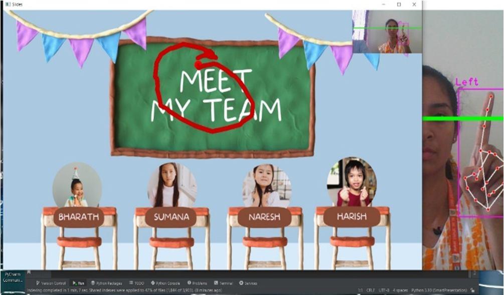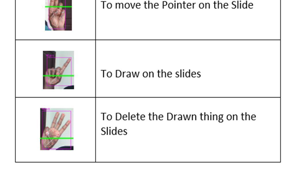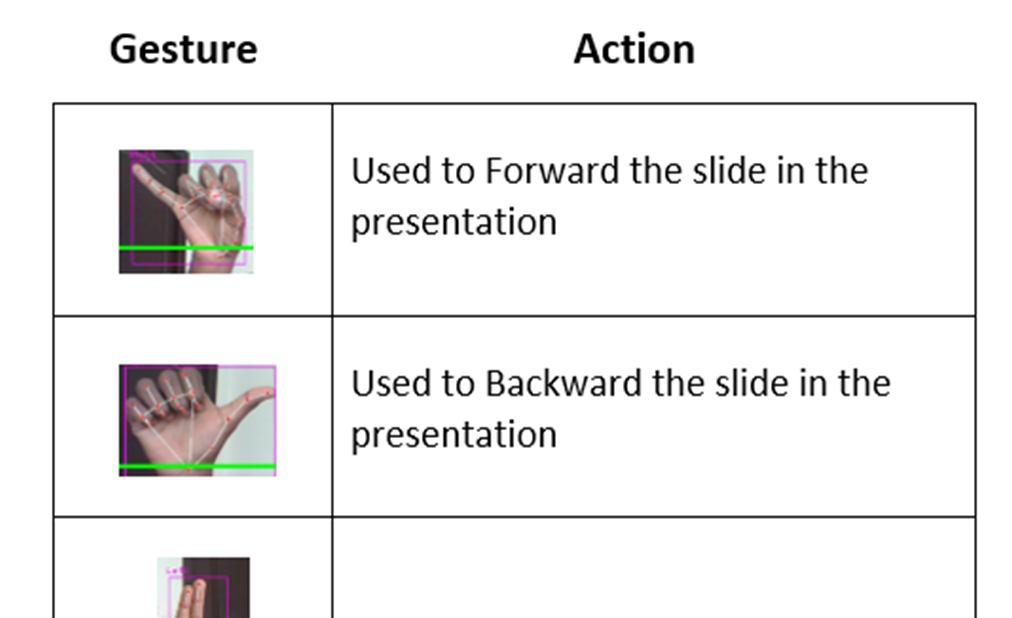2) Muhammad Idrees, ashfag Ahmad, Mahammad Arif Butt, Hafiz Mahammad Danish has proposed Controlling PowerPoint Using Hand Gestures in Python. Their research focused on removing distraction of presenter by allowing the presenter to manage slides solely by gesturing in front of the camera. We managed to map specific gestures for one action on the slides, including the next slide, previous slide, zoom in and out.