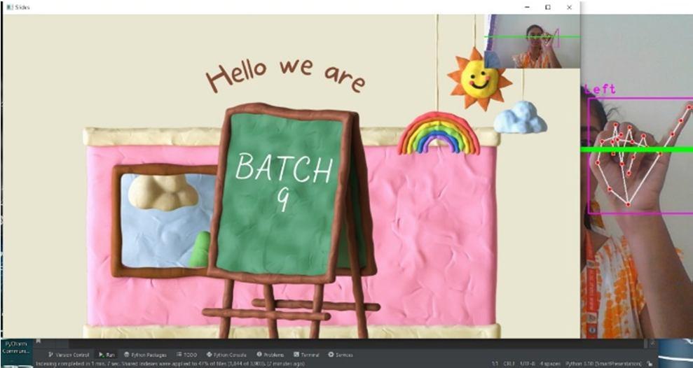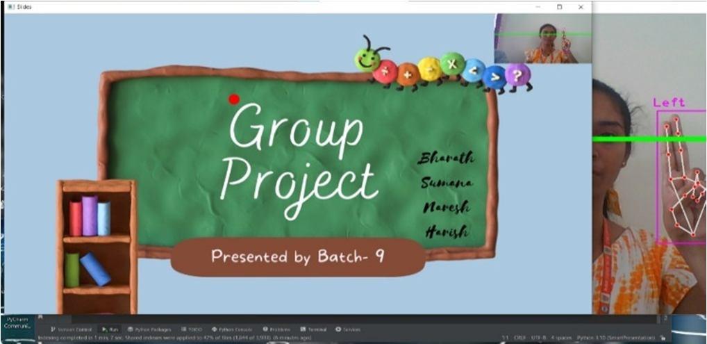 Abstract: Now-a-days presentations have a significant role in different fields of life. Whether you are a student, an entrepreneur, businessman, or a corporate worker, you must have had given presentations at some point in your life. PowerPoint presentations sometimes become less lively because either you have to use the keyboard to change and operate the slides or use a dedicated gadget to perform these tasks. We aimed to enable people to control the slideshow with the gestures of hands. The applications of gestures in human computer interaction have massively risen in the past few years. The research has tried to control different operations of the PowerPoint slideshow through gestures. This research has used Machine Learning to detect gestures with subtle differences and tried to map them with some fundamental PowerPoint slideshow controlling functions using Python. This project make the work of the presenter quite easy.