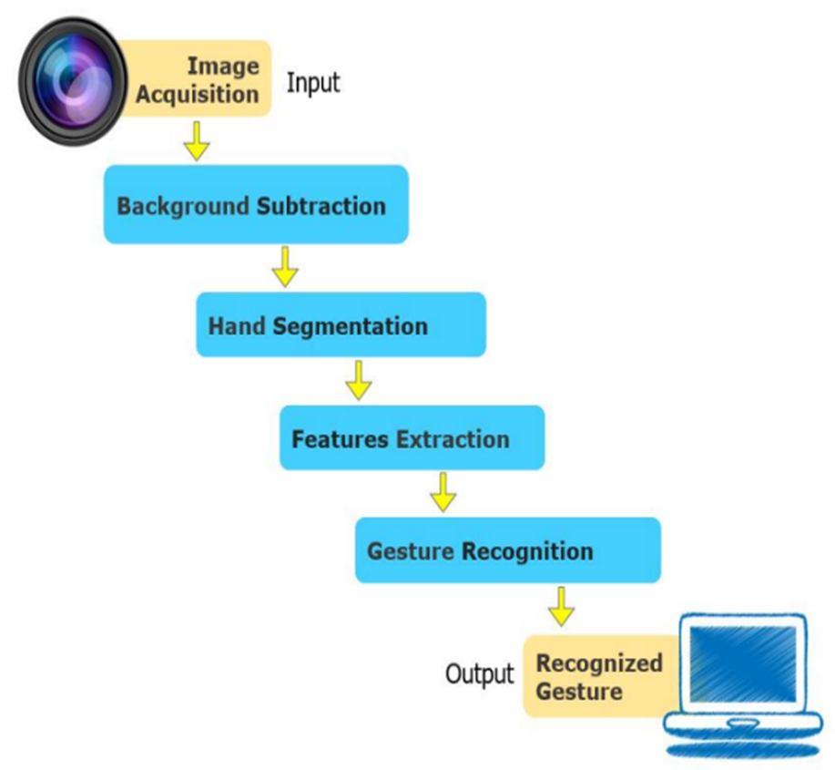 In the running world, gesture recognition plays a major role in the interaction between humans and computers. To facilitate simple yet user friendly communication between humans and computers hand Gestures can be used which enable us humans to interact with machines without having to use devices like keyboards, laser pens, mouse etc. The computer is more important in our daily with the development of technology. Computer applications require interaction between human and computer. Gesture includes physical moments of the fingers, hands, arms, head, face or other parts of the body. The new generation laptops contain built in webcam, touch screen mobile phones with front camera has increased the use of applications working on gestures. The flow of hand gesture recognition goes as follows.
