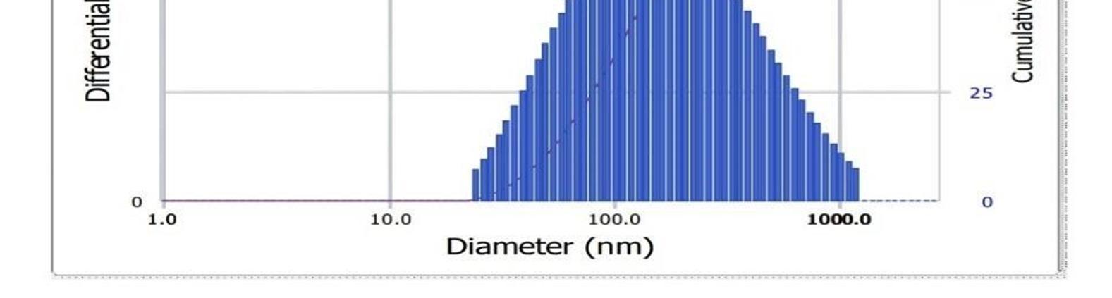 The size and the size distribution of the bio synthesized AgNPs in the colloidal suspension were measured using dynamic light scattering. Figure 4, depicts the range of synthesized AgNPs distributed from 10nm to 1000nm, found to have an overall average size of 228.3nm.