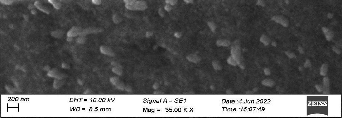 2) Scanning Electron Microscope: The SEM analysis was done to learn the external morphology, the size and crystalline structure of the formed AgNPs through direct visualization under the scanning electron microscope.