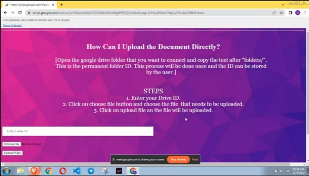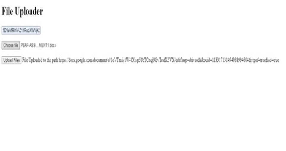 Also, backend was developed using Google Scripts to function behind the scenes for uploading the selected document. This is ouput of backend coding.