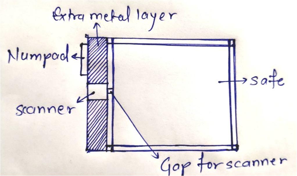 So, the design of our project consists of both hardware and software. The hardware part consists of security safe with numpad lock and roller scanner. The safe has an extra layer of metal with a gap where the roller scanner is fitted, the gap needs to be of 31.8 X 14.2 X 7.4 cm This metal layer provides the safe with extra security too. The numpad lock using Arduino is attached on top of this metal layer. Metal aligned to the scanner from where the document exits is horizontally removed from safe so that after scanning the document ends up inside the safe as can be seen in fig 2.