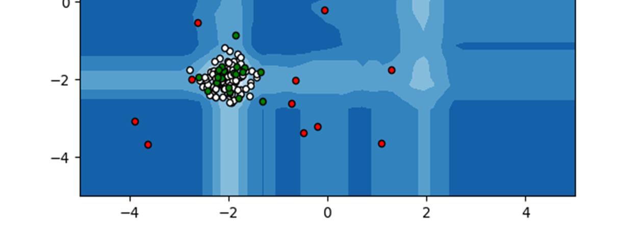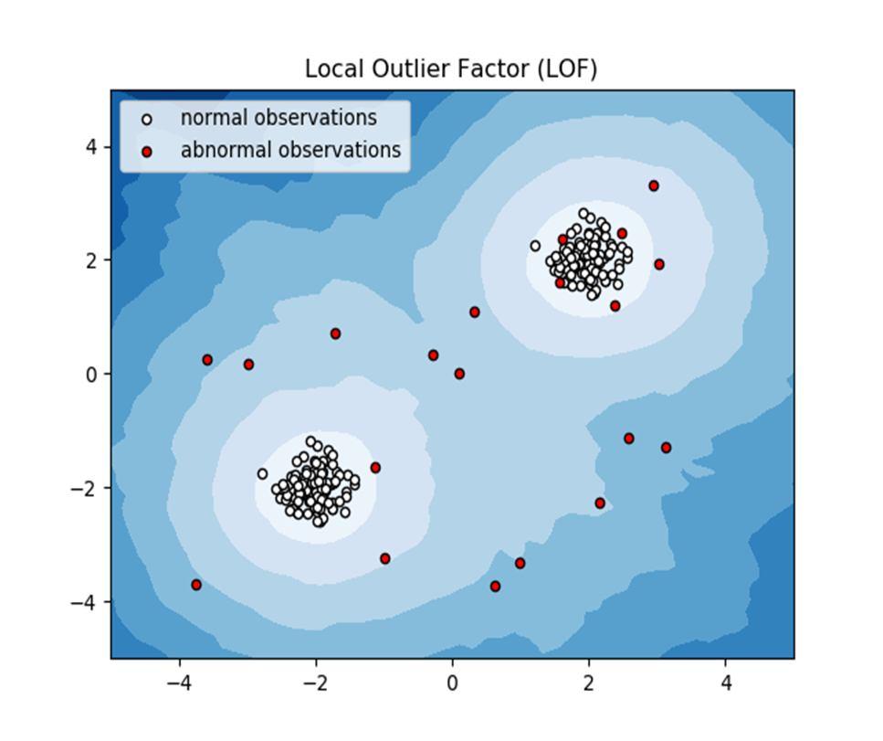 On plotting the results of Local Outlier Factor algorithm, we get the following figure: