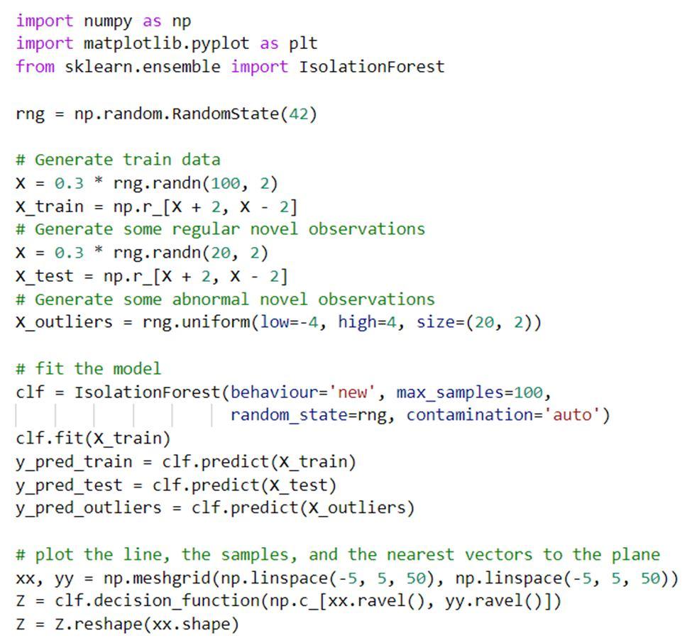 The Isolation Forest ‘isolates’ observations by arbitrarily selecting a feature and then randomly selecting a split value between the maximum and minimum values of the designated feature. Recursive partitioning can be represented by a tree, the number of splits required to isolate a sample is equivalent to the path length root node to terminating node.