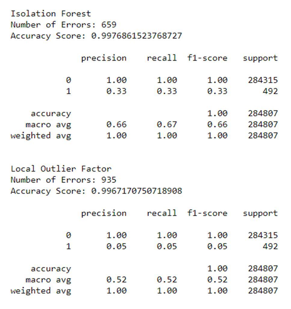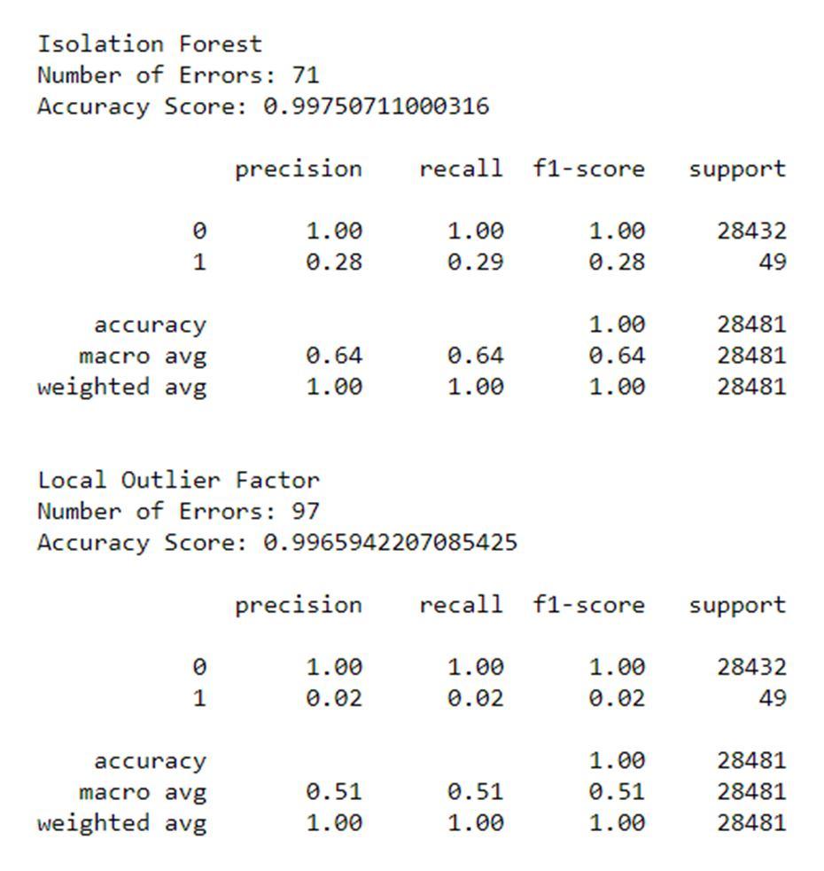 The code prints out the number of false positives it detected and compares it with the actual values. This is used to calculate the accuracy score and precision of the algorithms. The fraction of data we used for faster testing is 10% of the entire dataset. The complete dataset is also used at the end and both the results are printed. These results along with the classification report for each algorithm is given in the output as follows, where class 0 means the transaction was determined to be valid and 1 means it was determined as a fraud transaction. This result matched against the class values to check for false positives.