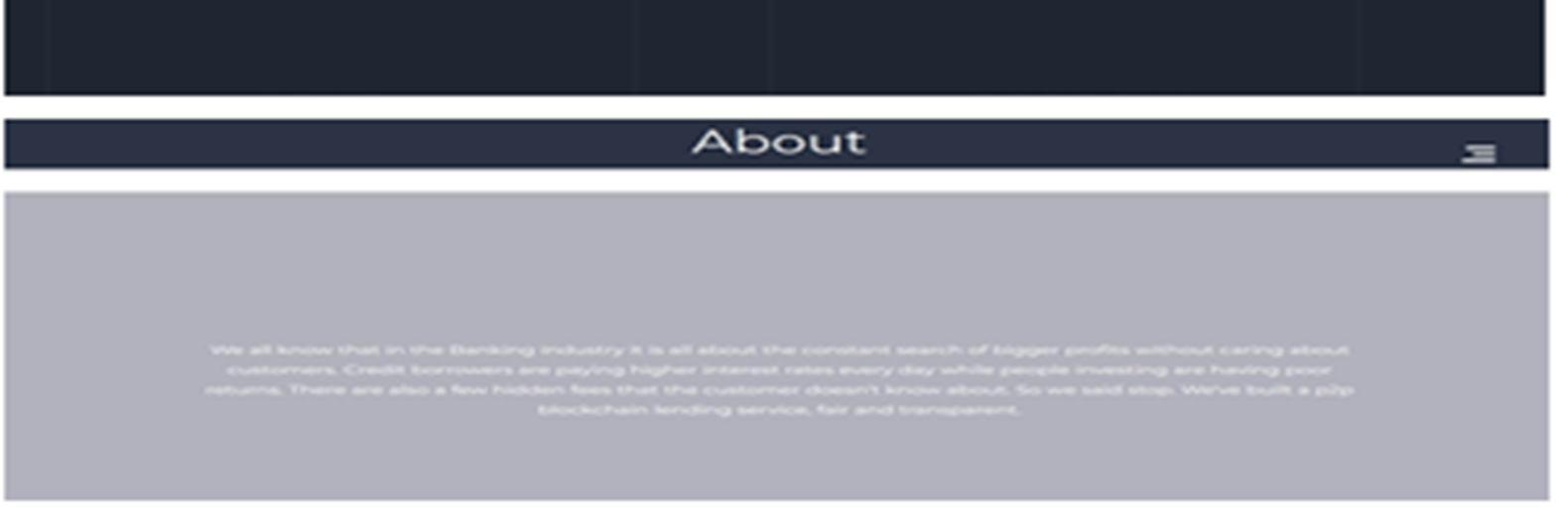 The first UI of the DApp is the sign up / login page. Once the user logs in, the welcome page appears. Then he/she has to sign a message using their private key and this signature is then stored in the bank database. If login not available, the user creates an account in the Banking website by entering his/her Public Key along with the basic information for KYC. Then, the Loanee / Representative of an organisation has to digitally sign a fixed message(previously set by the bank and updated periodically) using his/her Private key before applying for Loan.