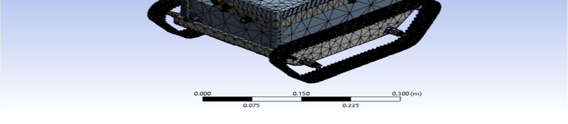 1) Meshing of Mini Fire Fighting Robot: Ansys provides general purpose, high performance, automated, intelligent meshing software that produces the most appropriate mesh for accurate, efficient Multiphysics solutions from easy, automatic meshing to highly crafted mesh.
