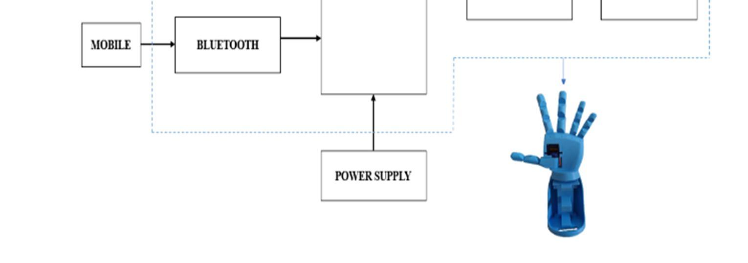 The project proposes a wearable glove controller, to control the movements in the prosthetic arm. The prototype consists of two main parts the glove and the prosthetic arm. Two wireless Bluetooth modules are used to establish wireless communication link between the glove controller and the prosthetic arm. The interconnection between hardware and software components used of the proposed prosthetic hand is as shown in Fig 1