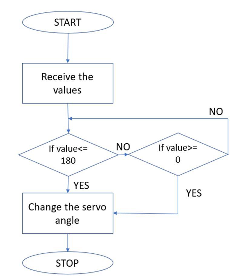 As shown in Figure shows the Work flow or the flow chart of the transmitter or in other words of the glove controller, as to how the input signals from the glove is transmitted to the receiver that is the prosthetic arm. These input signals from the glove controller control the movements of the prosthetic arm.