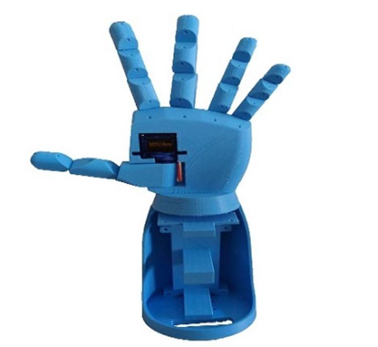 India, there are about 5 million disabled people (in movement/motor functions). The disabled people affected with neuromuscular disorders such as multiple sclerosis (MS) or amyotrophic lateral sclerosis (ALS), brain or spinal cord injury, Myasthenia gravis, brainstem stroke, cerebral palsy etc., In order to express themselves one must provide them with augmentative and alternative communication. A robotic arm is a type of mechanical arm usually programmable, with similar functions to a human arm. The arm has links connected by joints, allowing either rotational motion or translatory displacement. The result is a system analogous to the functioning of a human arm. Here in our project, the robotic arm has been built on a primitive basis, however much complex and sophisticated one can be built. The robot works on simple components like a steel frame for simulating fingers, sensors for detection of motion and is driven by the ARDUINO board. The arm includes a glove which will be worn and thesensors based on the movement of the fingers will cause the exact same replication in the 3D printed arm simulation (the robotic arm).