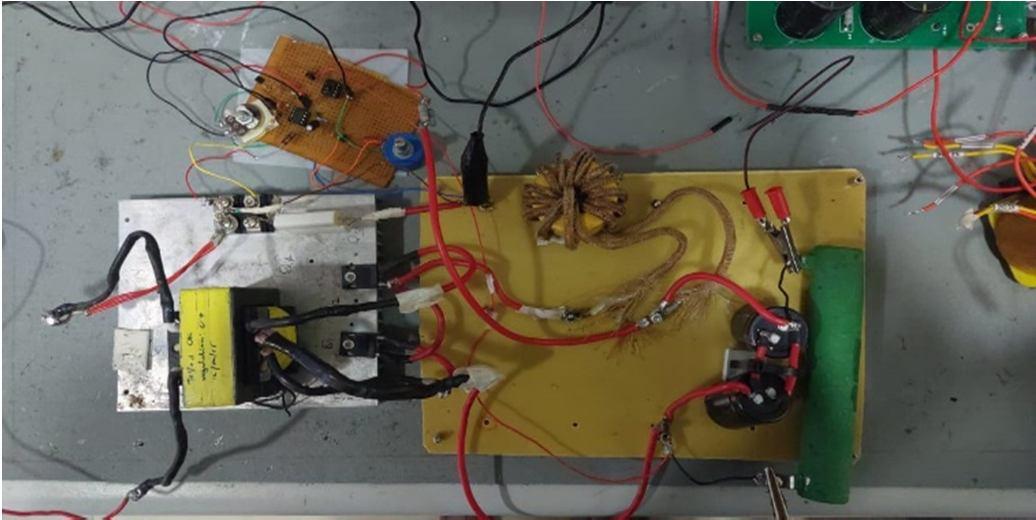 The Fig.4(b) shows the top view of the forward converter set up with the closed loop control attained by using IC UC3842.