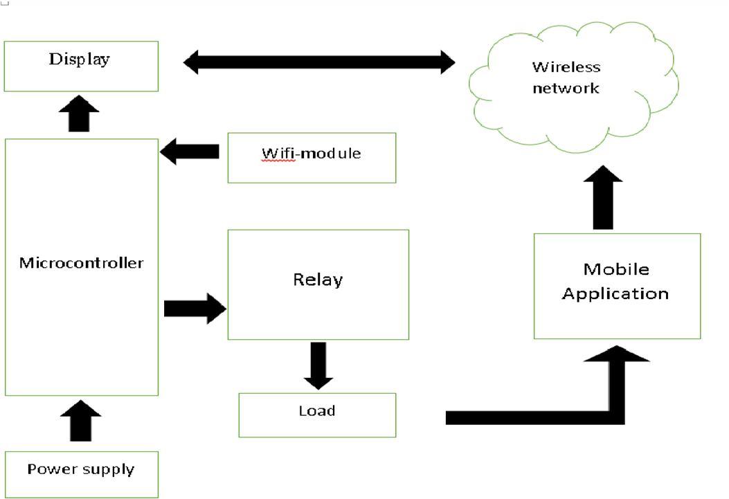 The functionality of the entire project is shown in the block diagram. The Node MCU unit is the system’s primary controller, or microcontroller. The user makes advantage of The functionality of the entire project is shown in the block di-agram. TheNode MCU unit is the system’s primary controller,or microcontroller. The user utilises the mobile applicationto programme commands for the appliances’ operation. The mobile app understands the user’s voice or switch instruction and delivers a signal to the Node MCU unit over a wireless network set up by Wi-Fi communication. Because of this,the Wi-Fi module, which is really embedded into the Node MCU, enables the microcontroller to connect via Wi-Fi to a device and receive commands from an application through a wireless network. After receiving the signal, the Node MCU uses a relay to switch the appliance on or off. The relay,final appliances, and Node MCU are all physically connected. The microprocessor,he relay, and the finishing appliances are all powered by a separate power supply unit. The state of the application is also shown on a display unit.