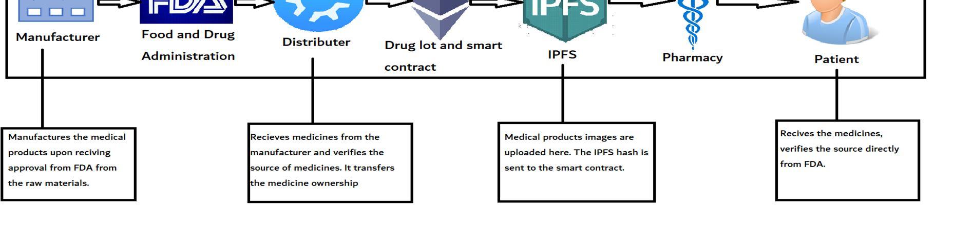 From the purchase of basic materials toward the distribution of the final item to the clients, the supply chain is an intricate structure composed of various separate businesses. The counterfeiting of medical supplies is just one of the issues that a system this intricate is sure to have. Not only are fake medical items bad for patients, but they also cost the pharmaceutical and healthcare sectors a lot of money. Such problems must be fixed, and measures to boost supply chain system transparency should be done. With the introduction of blockchain inside the supply chain industry, transparency may be addressed. The core concept with a blockchain is similarly to something like a linked list in where both retain a replica of information that had been previously present with in nodes who came before them. Numerous industries have adopted the blockchain. With no need for a centralised authority, a peer-to-peer network was created with the aid of these produced apps. The detection and traceability of medicinal products can be accomplished utilising a variety of blockchain-based solutions. This article also focuses on the obstacles and restrictions associated with applying blockchain technology to the healthcare industry. The stakeholders in a general medical supply chain are Food and Drug Administrator (FDA), the manufacturers, the distributor, the pharmacies and finally the customer.
