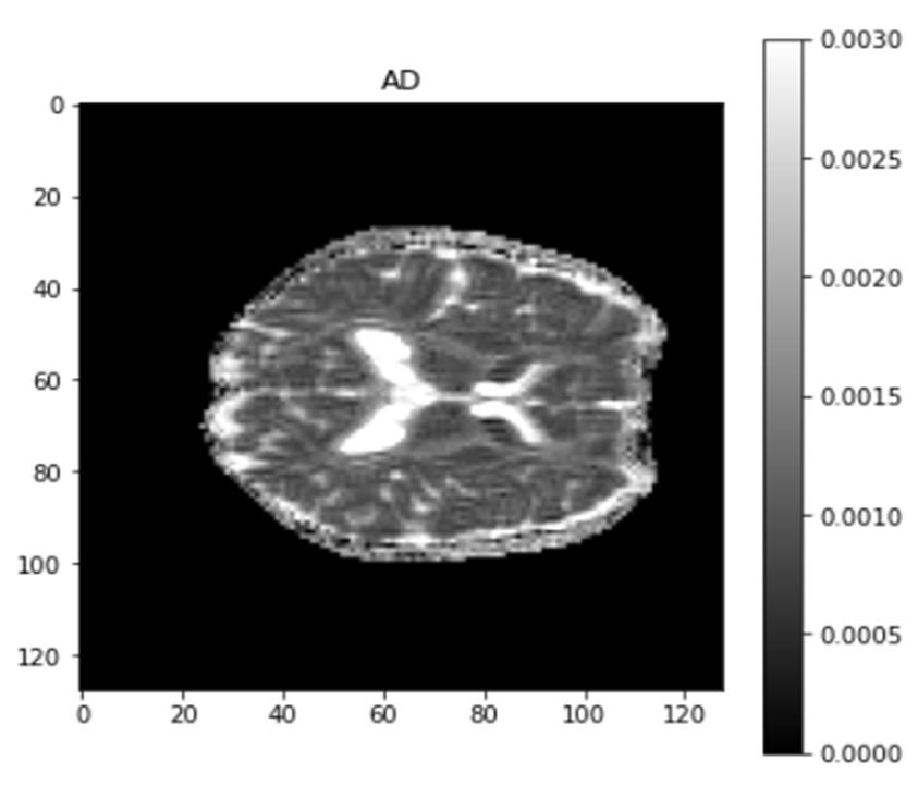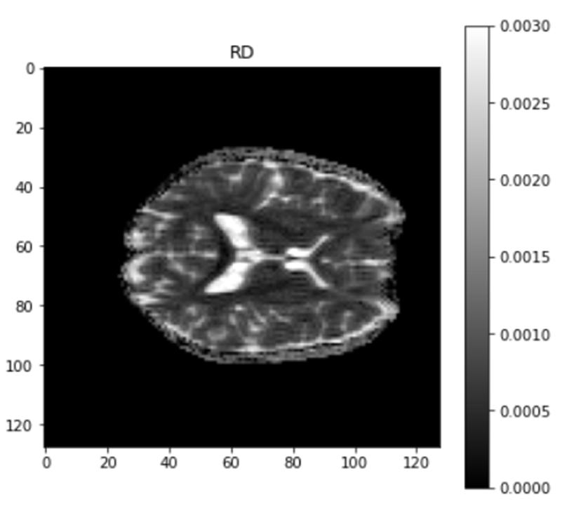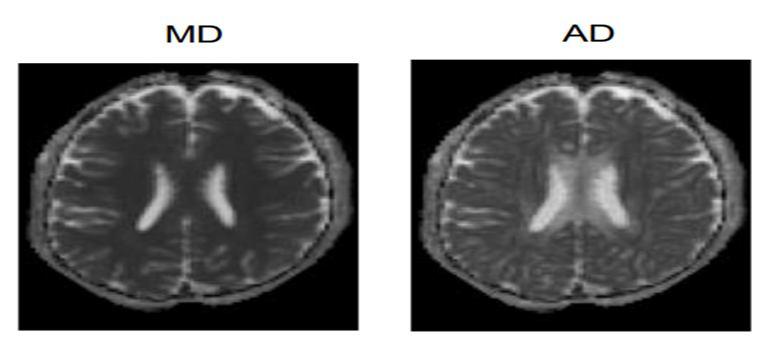 When it comes to AD and RD maps, we are able to identify changes in the axonal parameter by adjusting the white matter area. This allows us to better understand the connections between neurons. In AD, the main water movement is strongly focused, along primary axis. but in RD, it is focused transverse to the long axis.