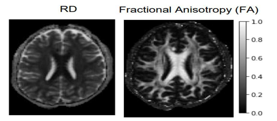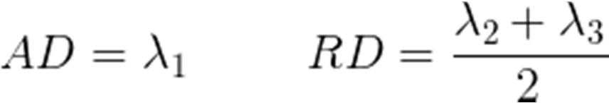 Axial diffusivity (AD) and radial diffusivity (RD) are the Additional measures necessary to further define the tensor if two tensors with different forms provide identical FA values. AD describes the diffusion rate along the primary axis of diffusion, along ( ), or parallel to the axon (and hence, some works refer to it as parallel diffusivity). On the other hand, RD is the average diffusivity along the minor axes(being named perpendicular diffusivity). Where both are measured in mm^2/s.