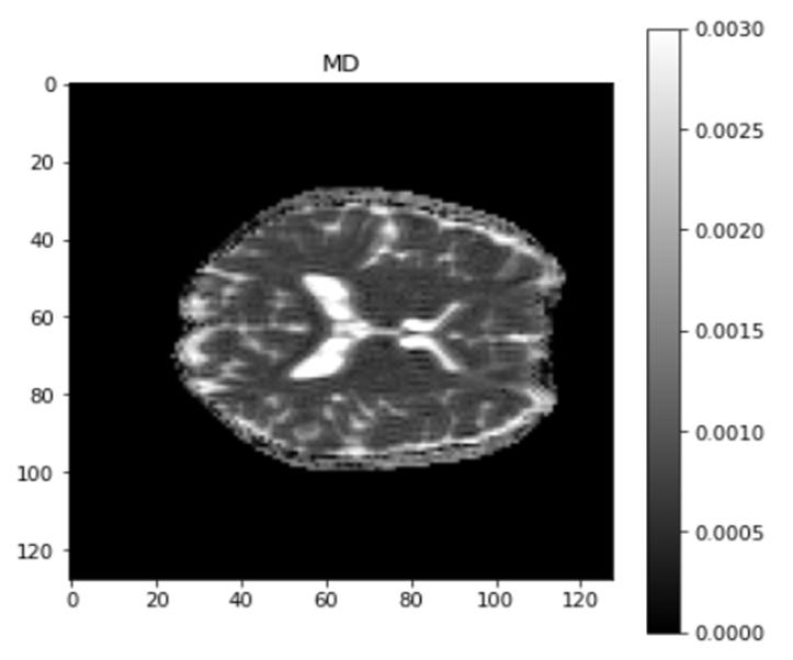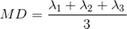 Mean diffusivity (MD) is a measure of the degree of diffusion, independent of direction. This is sometimes known as the apparent diffusion coefficient (ADC).MD is determined mathematically as the mean eigenvalues of the tensor and is measured in mm2/s. It often used complementarymeasures to FA.