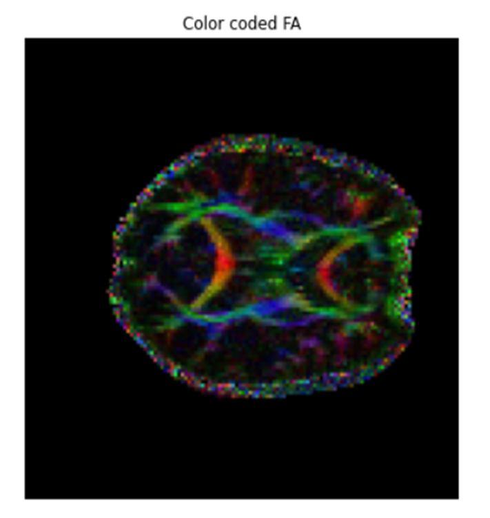 There are several ways of visualizing tensors. One of the approaches is to use an RGB map that overlays the major diffusion orientation on an FA map. The colours of this map encode the diffusion orientation. This map provides directional information (e.g., whether the diffusion flows from right to left or vice versa), with the help of the DIPY Python library, we can use the color_fa function. The colours correspond to the following architectures: