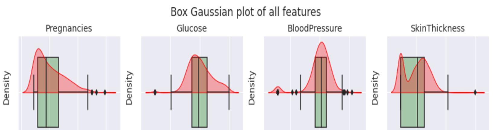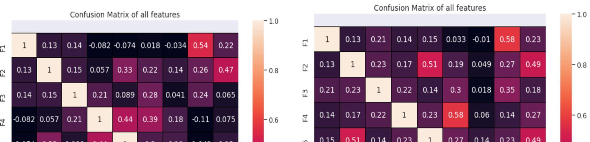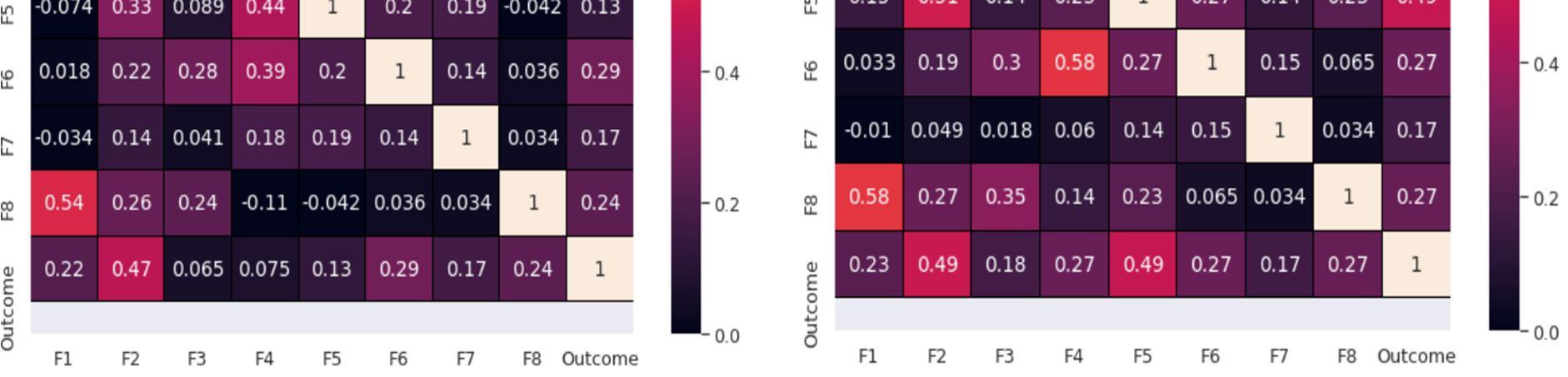 Most of the data of the attributes in the Dataset is incomplete due to presence of the outliers and missing values so the data has to be processed through certain pre processing techniques so that the ML model can outrun the incompetence of the dataset and can be trained for better results. However, because of the presence of outliers in the data it introduces kurtosis and skewness in the distribution of attribute’s Fig.4(a) and high kurtosis is an indication for presence of a greater number of outliers in the data. Skewness and Kurtosis will affect the result in such a waythat will lead to underestimation and overestimation of the expected value respectively. As demonstrated in the (Fig (4)) result of outlier rejection of the dataset the skewness of the distribution is moved to zero means (Fig.4(b)) indicating attribute’s mean value and median value have almost coincided. Confusion matrix mentioned below (Fig.5) shows the results of the raw data after going through the pre processing techniques i.e., results of the data after removal of outliers and replacing missing values. Figures Fig.5(a) and Fig.5(b) shows the qualitative and quantitative analysis of the increase in correlation coefficient implying that the correlation between attribute and the target outcome has been improved after the data has been processed by removal of outliers and missing values replaced by the mean of the attribute they belong to. when we observe the results closely removal of outliers and replacing missing values helped to improve the correlation coefficient for the F3, F4 and F5 with respect to outcome. This improvement in correlation helps us to select the most correlated attributes in feature selection.