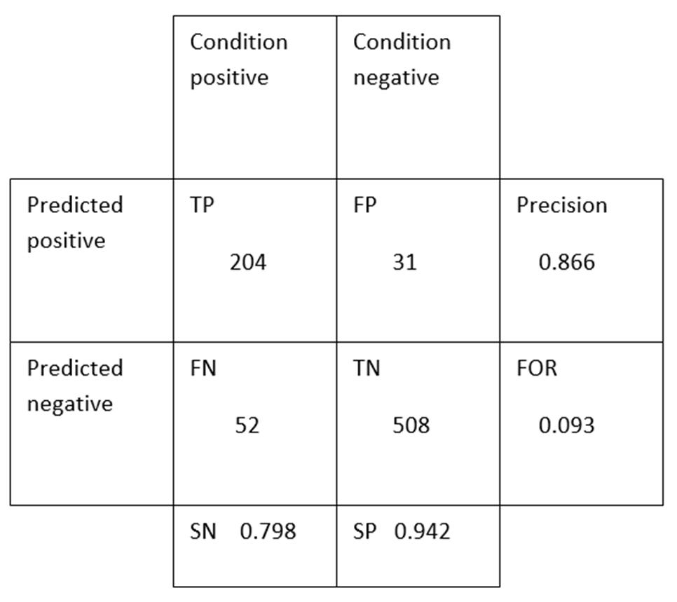 Sensitivity 81% 80.2% 79.8% Specificity 93% 92.6% 94.2% Accuracy 89.1% 88.6% 89.6% FOR 89% 93% 93% DOR 64.162 69.53 89.55 AUC 95.4% 95.5% 96.1%