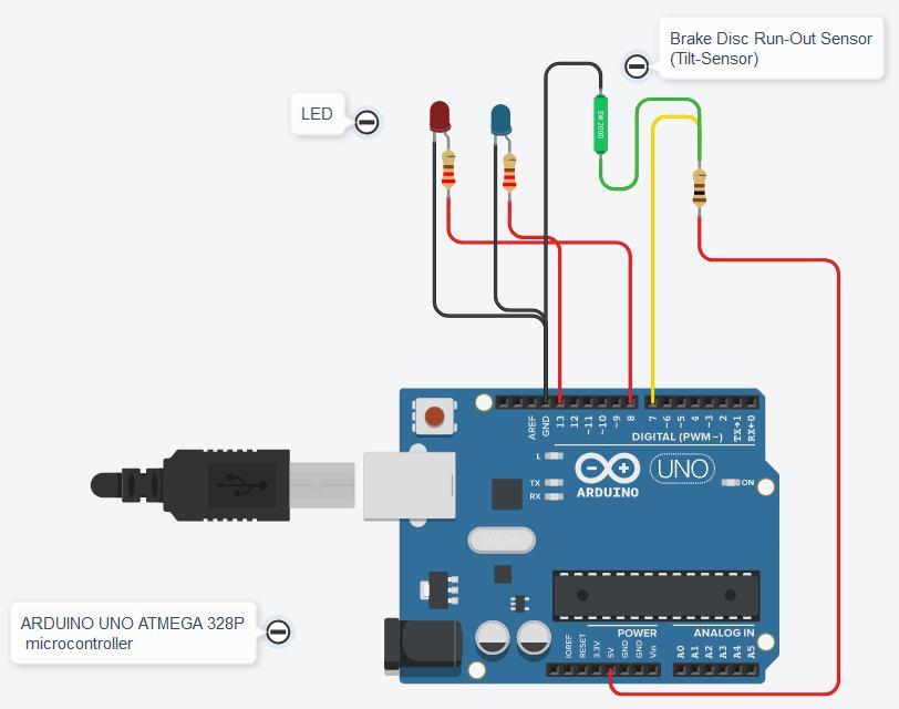 Keywords: Tilt sensor, Disc Run-Out, Arduino, Microcontroller, Brake Shudder, disc brake, Wobble, TinkerCAD, Disc Brake, Arduino Uno, C++.