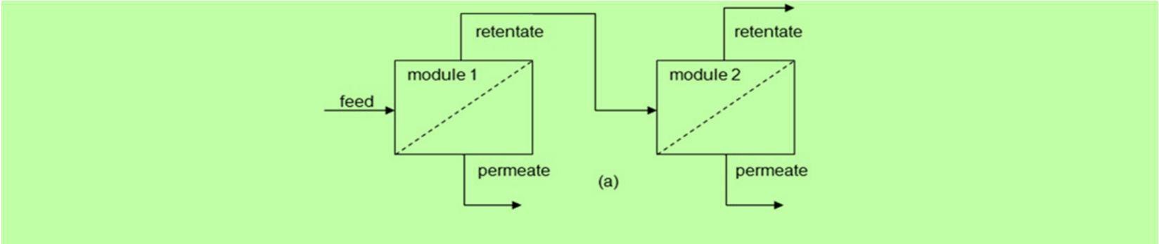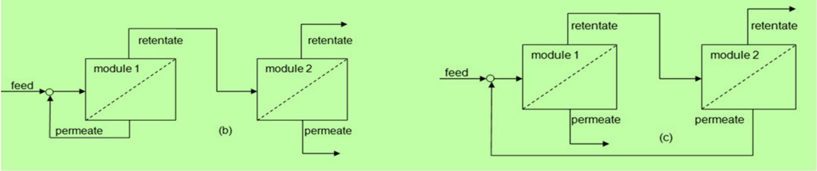 Fig 3: Design arrangement of 2 stage permeator system (b, c) with or (a) without recycling stream