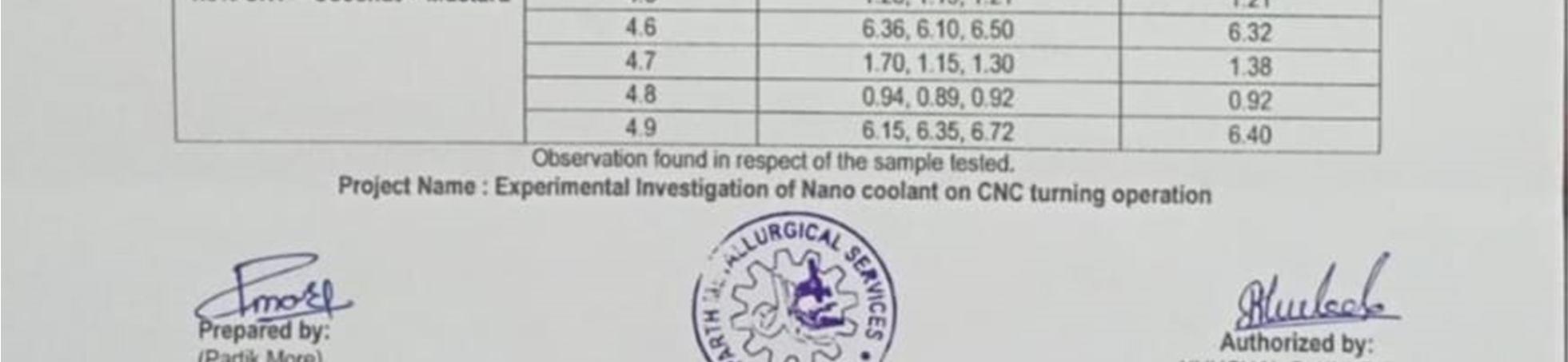 For the turning operation on CNC machine, we select the four different conditions Dry turning, conventional cooling, MQL turning with rice bran oil as a base fluid and another again MQL withedible oil as a base fluid. Then finally we get nanofluid MQL. Following is the experimental tablefor all this condition showing the range of Cutting speed, feed rate, and depth of cut.