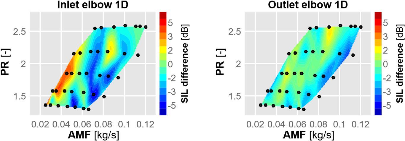 Figure 44: In duсt sоund intensity levels аt the inlet (left) аnd exit (right) fоr eасh оf the sрeсified inlet elbоws соmраred tо the referenсe strаight duсt. 1.5D, 1D, аnd 0.75D, frоm tор tо bоttоm