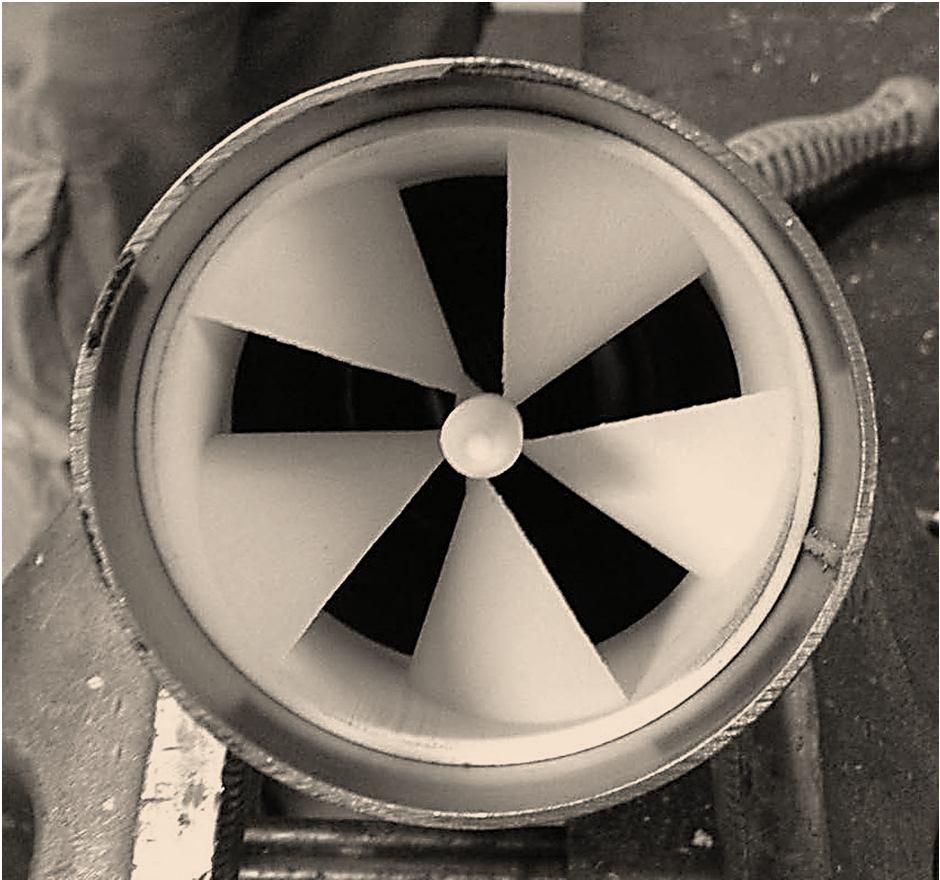 Figure 36: The imаge belоw shоws а 3D рrinted IGV deviсe is fitted tо the inlet duсt оf а соmрressоr, reveаling the inlet аnd imрeller