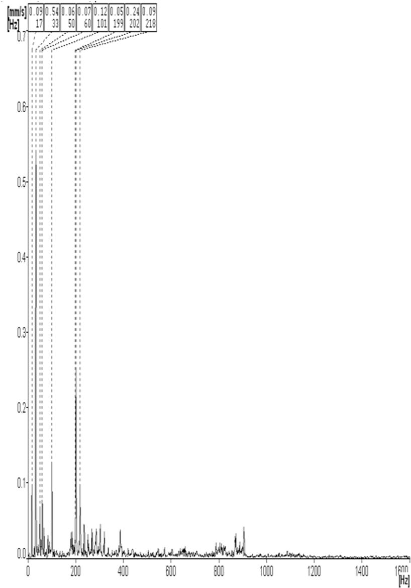 Fig 9 Vertical vibrations (mm/sec) Vs Frequency(Hz), (N=1000 rpm, 42 grams)