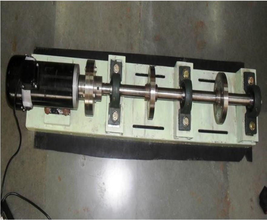 The test rig consists of a shaft with two rotor disc, which is supported on three ballbearings. A dc motor coupled by a flexible coupling drives the shaft. The parameters used in studies are given in table 1. The actual rotor rig is also shown in fig 1 this rig consist of a shaft of 30 mm diameter and 600 mm length mounted in between the three SKF single row groove ball bearing. Two disc of 130 mm diameter and 18 mm thick is fixed at the mid span of the two bearing each. The disc consists of 4drilled holes on the periphery at a radius of 45 mm to fix the balancing mass. The rotor rig is driven by1 HP motor running at a speed of 300 RPM. A coupling connects the driver and driven shaft. The measuring instruments used in the experimental set up. An accelerometer is mounted with a stud on the ball bearing housing. The output of the accelerometer is connected to the FFT.