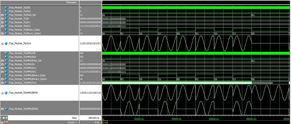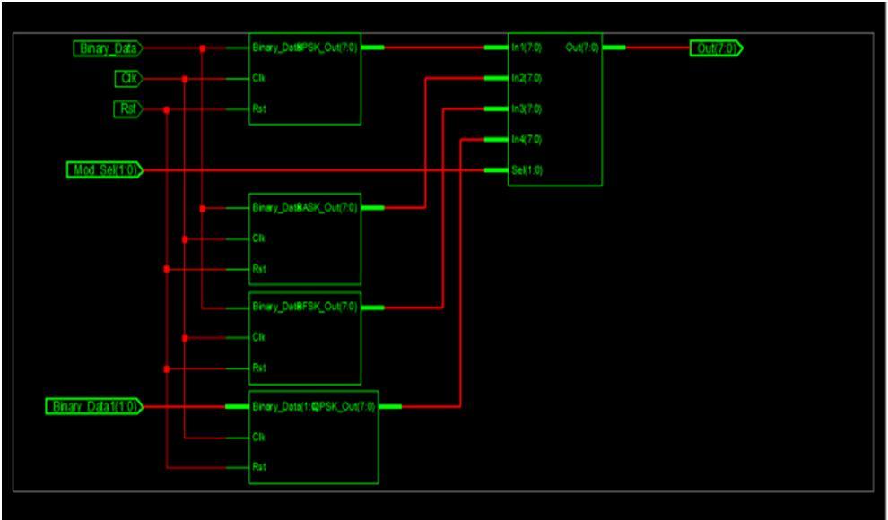 In general communication modulation is “the process of varying one or more properties of a periodic waveform i.e., the carrier signal, for transmitting a modulating signal that contains information”. Modulation of a sine waveform is used to transform a baseband message signal into a pass band signal. A device that performs modulation is known as a modulator. A device that performs the inverse operation of modulation is known as a demodulator. A device that performs operations as modulator and demodulator is known as modem. The digital modulators major work is to transfer a digital bit stream over an analog band pass channel, for example over the wireless network (where a limit of band pass filter ranges in frequency is between 150 and 3400 Hz), or over a limited radio frequency band. Digital modulation facilitate frequency division multiplexing (FDM), where several low pass information signals are transferred simultaneously over the same shared physical medium, using separate pass band channels (several different carrier frequencies). And the line coding, is to transfer a digital bit stream over a base band channel, typically a non filtered copper wire such as a serial bus or a wired local area network as it is one of the aim of digital modulators. The aim of digital modulation methods is to transfer a narrow band digital signal, in this scheme, as a bit stream over another digital transmission system. Despite simple transmitter and receiver architecture of Digital modulators and its modulation technique is still commonly used in wireless communication such as WPAN (Wireless Personal Area Network). Amplitude shift keying (ASK) is data transfer technique with different amplitude of carrier frequency. As it is sensitive to propagate the channel variation, thus it is has been widely used in low power wireless transceiver for system simplicity. For low power consumption, wireless communication systems exist in implantable medical devices, ingestible capsule endoscopy and multichannel neural recording. The ASK modulation/demodulation scheme, for both RF band and baseband transceiver, was presented. This design is realized on future mobile memory I/O interface for energy efficient. However, BPSK is as well as showing better Bit. These digital modulation techniques were implemented on FPGA device. Simulation results consist of bit error rate of digital signals of modulators, source consumption of BASK, BFSK, BPSK and QAM FPGA based, bit rate of BASK and BPSK on Xilinx ISE suite complier using verilog language. Thus digital modulators were implemented on FPGA. In addition to, bit error rate of BASK and BPSK modulation techniques was compared using Xilinx. In this paper, for BPSK and BASK modulation, FPGA based modulator is presented. Finally, simulation results are obtained. Whereas BPSK, QPSK, 16 QAM and 64 QAM are the permitted modulation schemes. Our work includes multimode inter leaver design with all possible modulation scheme permitted. The inter leaver comprises of two blocks: address generator and inter leaver memory. The former is FSM based and the later is implemented using internal memory of FPGA. The FSM based address generator operates at higher frequency and can provide better FPGA resource utilization. Use of internal memory always provides better results in terms of memory access time, power consumption and real estate occupancy of circuit board compared to external memory.