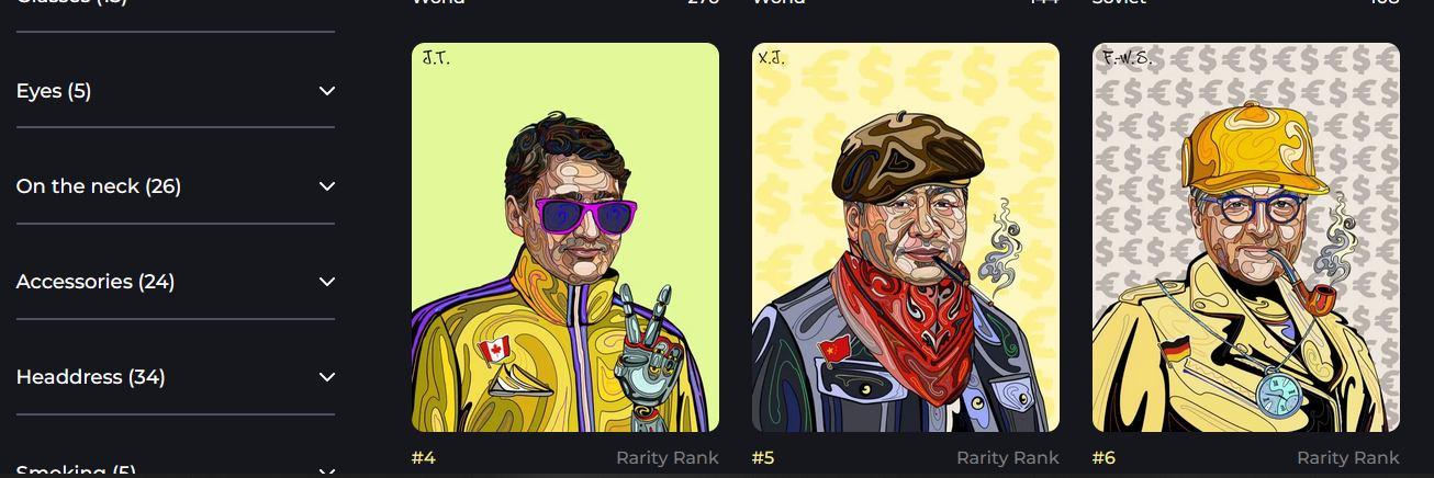 It's also a great way to get people interested in learning about different presidents from around the globe. If you're a collector, this is definitely a project you'll want to keep an eye on! There are eight categories to choose from: World, World Legends, USA, USA Legends, Soviet, Crypto, Secrets, and an individual avatar of Satoshi Nakamoto, creator of the protocol used in blockchains (Victoria Zavyalova, 2022).