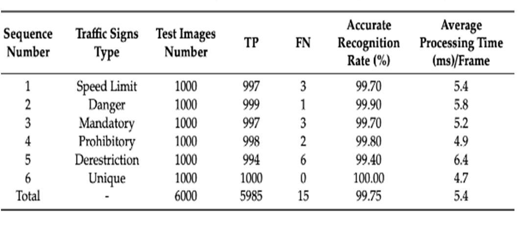 In order to assess the improved CNN network models thorough recognize capabilities for various sorts of traffic signs, a total of 1000 test images are chosen randomly for analysis and classification from five types of traffic signs specified roughly in the collection. Table 3shows the results of six different traffic sign categorization and identification tests..
