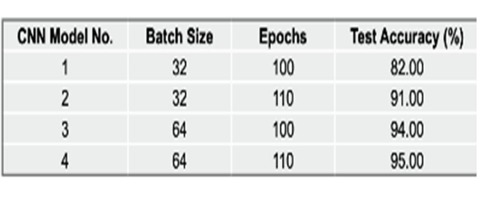 After building the layout of the object. The model is established, and or the data are prepared. We first should configure the learning algorithm, test sets, batch size, and time steps before we can start training our model. Therefore, we employed several Cnn model. For the classifier. We played around with different batch sizes and activation algorithms. All of our implemented models are detailed in Table 3